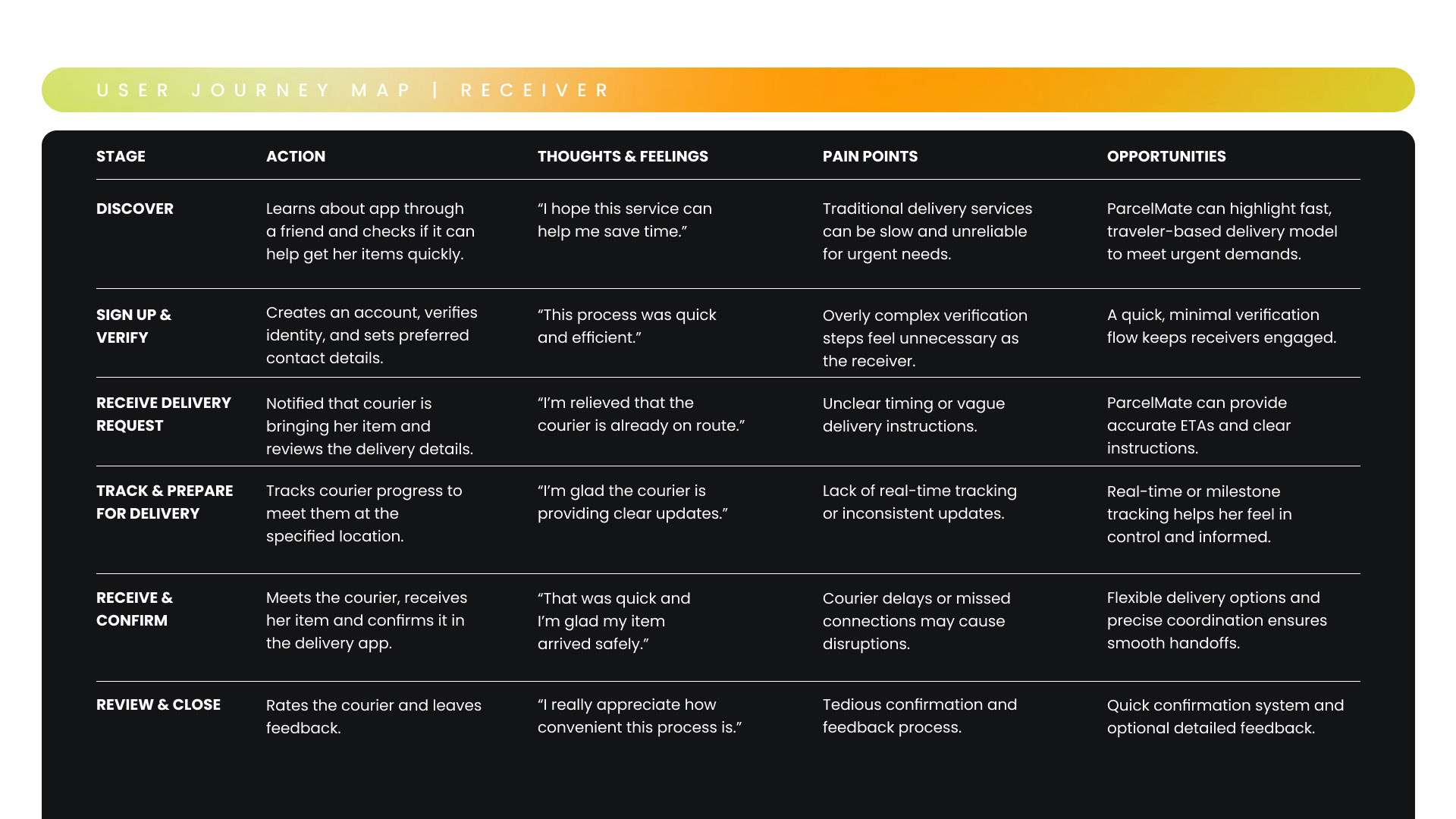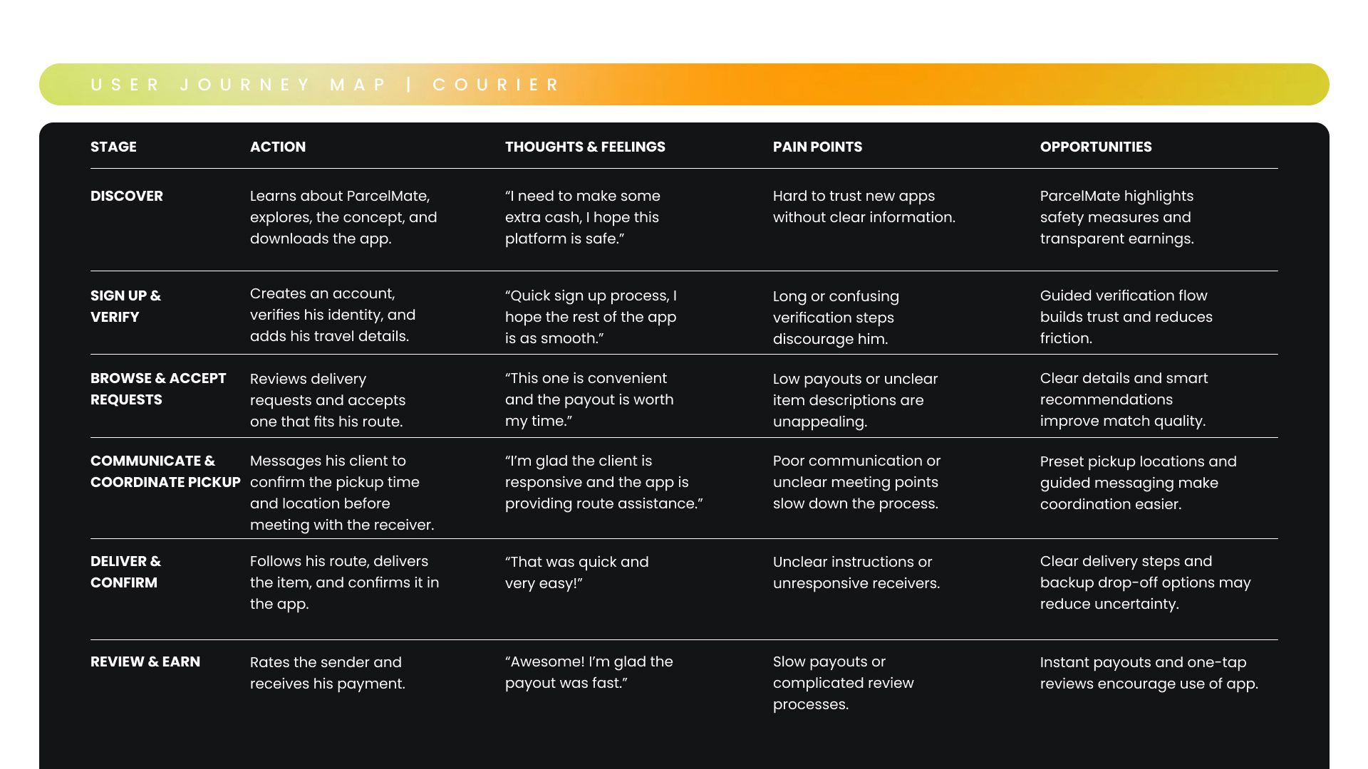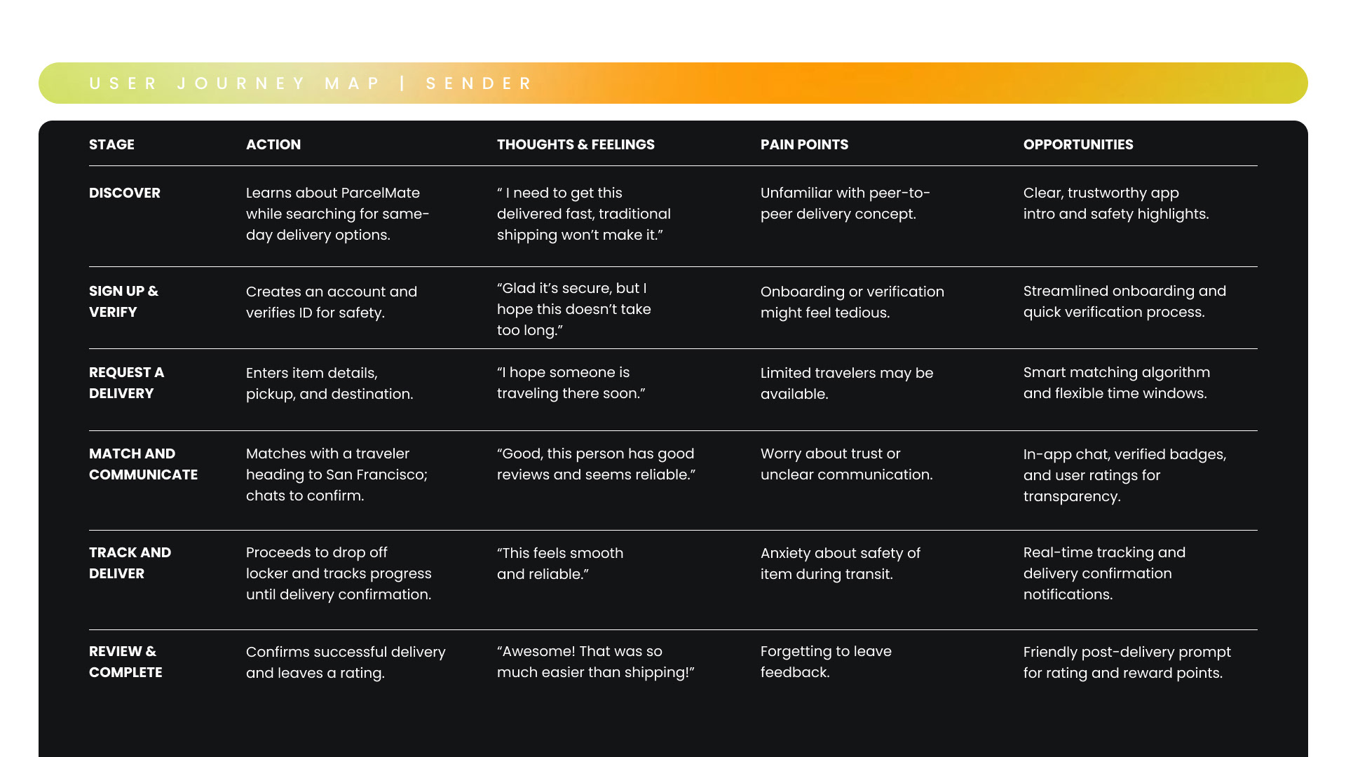 User journey maps were created to understand the experience from three key perspectives: the sender, the courier, and the recipient. Mapping each role separately helped identify unique needs, touchpoints, and potential friction points throughout the delivery process.