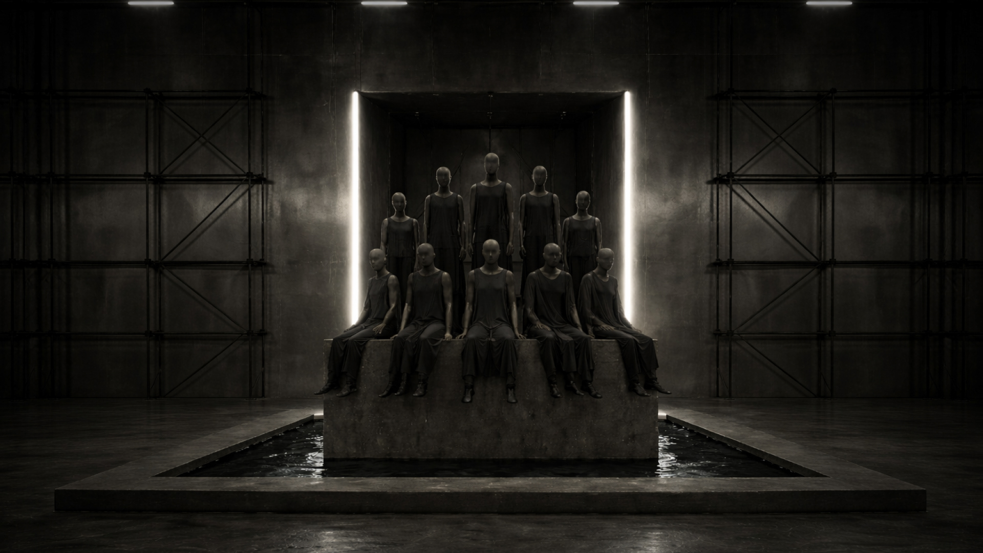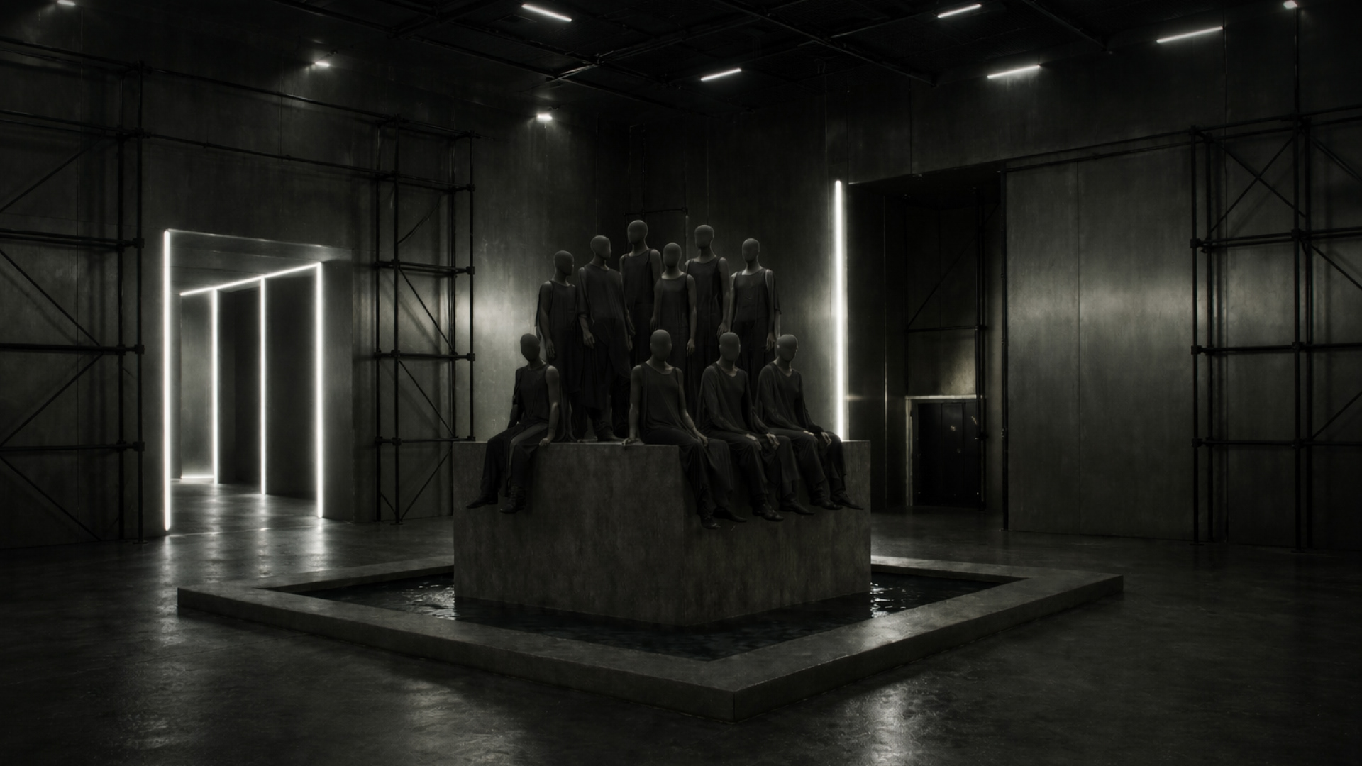 At the center of the room is a shallow reflective pool that creates the illusion of walking on water, echoing the runway experience.