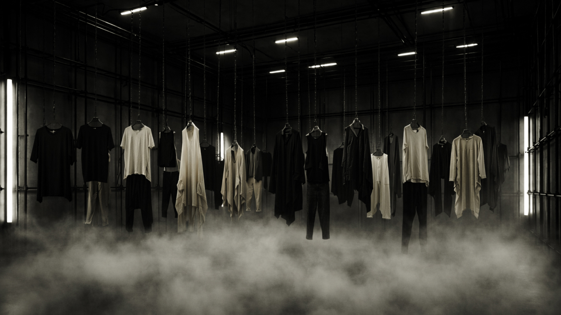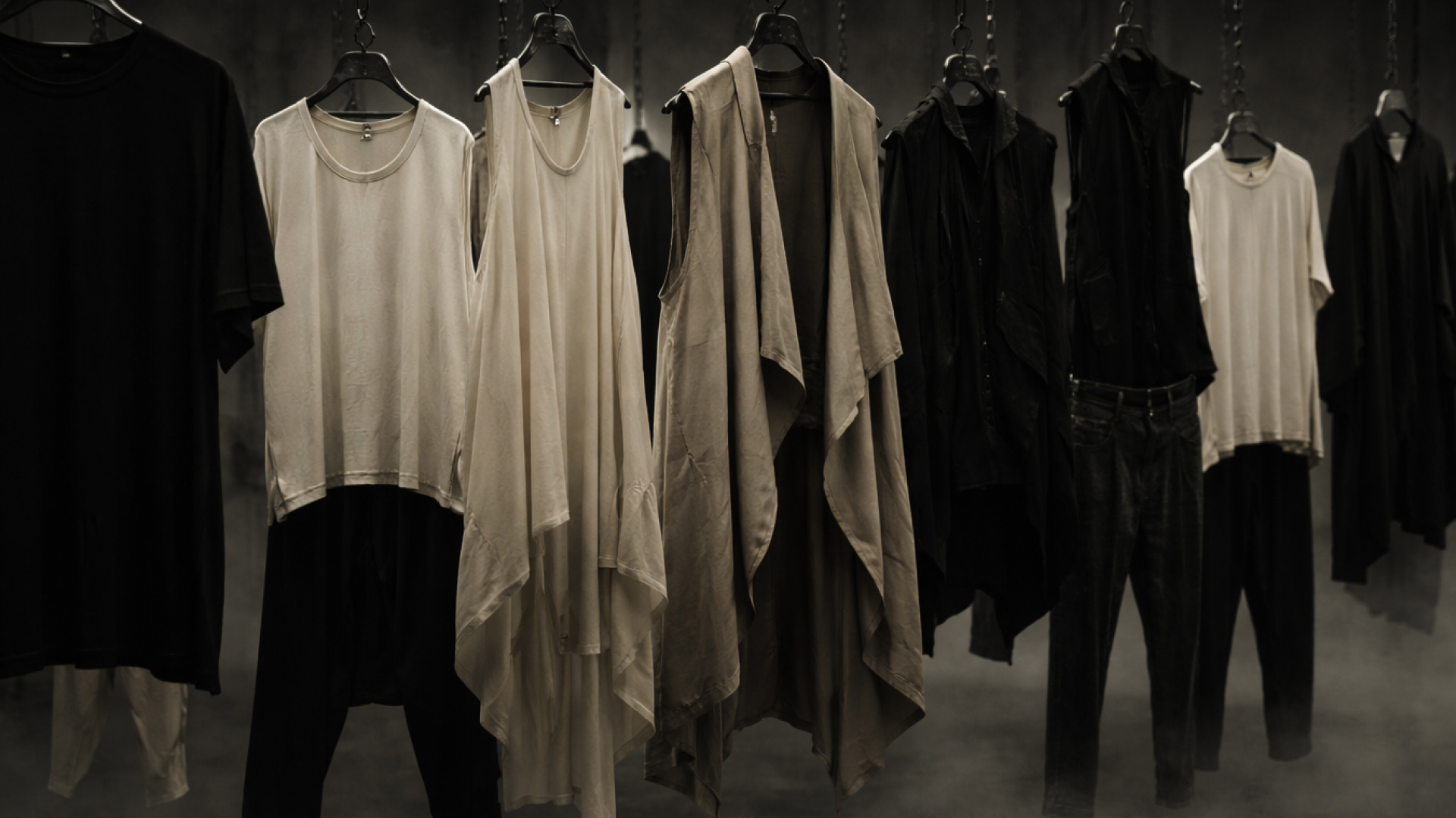 This room functions as an immersive exhibition space for Rick Owens’ newest designs. Garments are suspended throughout the room and carefully lit to highlight their structure, texture, and movement, offering visitors an intimate, gallery-like experience.