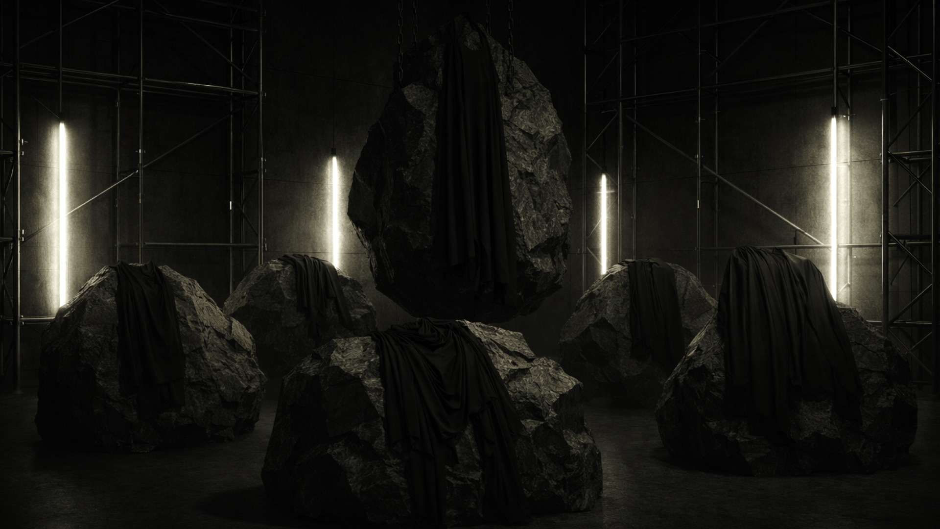 Room 03 intensifies the exhibition experience through the presence of colossal monoliths that rise from the floor, extend from the walls, and hang overhead.